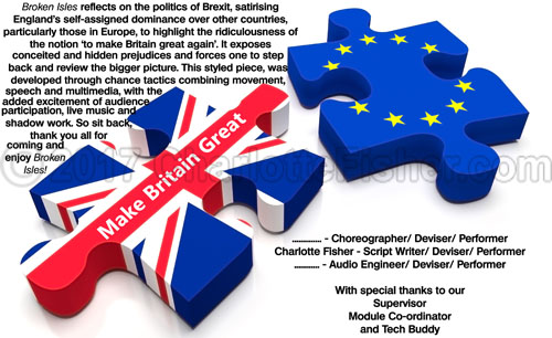 Broken Isles was also a piece that Charlotte developed whilst at University with two course mates. The piece was largely inspired by Akram Khan's 'Zero Degrees'. The piece began as an exploration into the way fear and pain, although globally recognised concepts, are communicated very differently. This soon developed into a more politcal piece of theatre, developed around the time that Brexit was announced, it challenged British 'greatness' and questioned whether the nation is perhaps outdated in regards to it's approaches to other nationalities and it's own position in the world. The creative team wanted to begin to tackle cultrual prejudices and racial misconceptions.