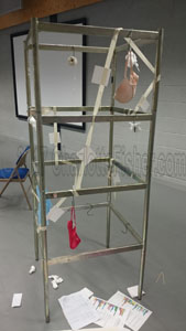 Some of these tasks were things like: wrapping tape around the frame, followed by string, hanging some hooks which were then used to hold other props, cleaning amongst others. At the start of the piece all props were on Charlotte's body and as the piece progressed, were put on display in some way.